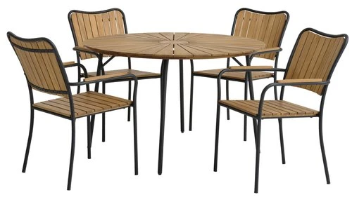 Bord: Stål och oljat FSC® hårdträ. Ø120 x H74 cm. Stol: Galvaniserat stål och oljat FSC® hårdträ. Stapelbar.