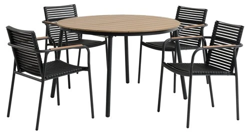 | Material | Ställning: Aluminium, Bordsskiva: Konstträ (polystyren)Konstträ är ett underhållsfritt, syntetiskt material med naturlig trälook. Det är tillverkat av plast, såsom polystyren, som ger ett slitstarkt och väderbeständigt material. Konstträ är UV-skyddat, vilket säkerställer en färgbeständig yta., Ben: Stål |