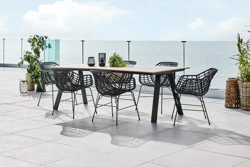 Bord: Aluminium och konstträ. B100 x L220 x H74 cm. Stol: Stål och konstrotting.