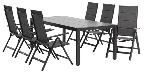 Bord: Aluminium och DURAWOOD® kompositträ, ett slitstarkt kompositmaterial som består av FSC® hårdträfiber och plast. B100 x L214 x H74 cm. Stol: Aluminium, textilene och snabbtorkande skumstoppning. 6 positioner. Hopfällbar.