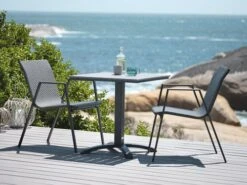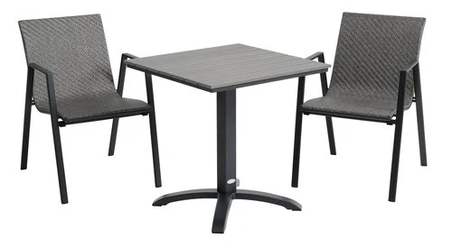 Bord: Aluminium och konstträ. B70 x L70 x H72 cm. Stol: Stål och konstrotting. Stapelbar.