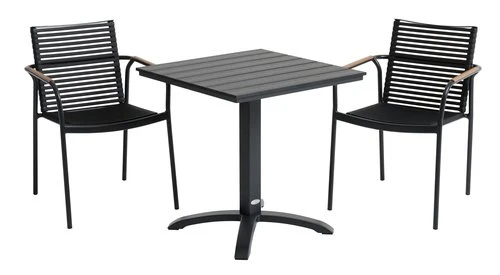 Bord: Aluminium och konstträ. B70 x L70 x H72 cm. Stol: Aluminium och UV-skyddad plast. Stapelbar.