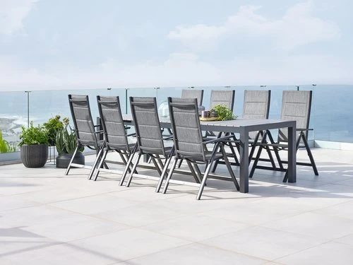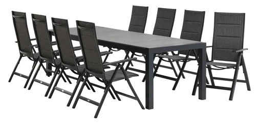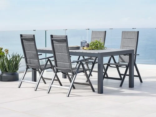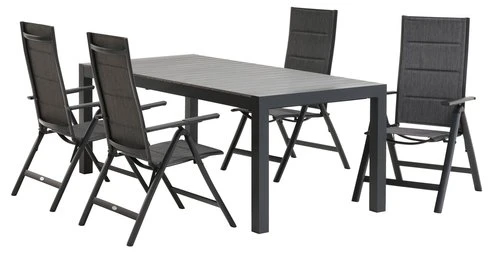 Bord: Aluminium och konstträ. Inkl. 1 klaff, som kan förvaras under bordsskivan. B95 x L205/275 x H76 cm. Stol: Aluminium, textilene och snabbtorkande skumstoppning. 6 positioner. Hopfällbar.