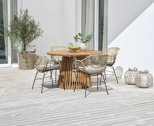 Bord: Oljat FSC® hårdträ. Ø120 x H74 cm. Stol: Stål och konstrotting.