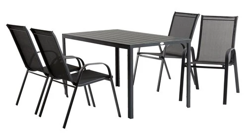 Bord: Aluminium och konstträ. B80 x L140 x H74 cm. Stol: Stål och textilene. Stapelbar.