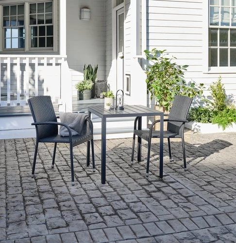 Bord: Aluminium och konstträ. B70 x L70 x H74 cm. Stol: Stål och konstrotting. Stapelbar.