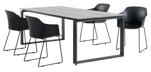 Bord: Aluminium och DURAWOOD® kompositträ, ett slitstarkt kompositmaterial som består av FSC® hårdträfiber och plast. B100 x L215 x H75 cm. Stol: Stål och formgjuten, UV-skyddad plast.