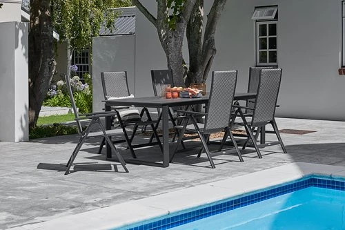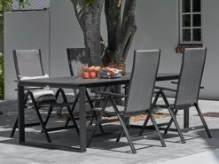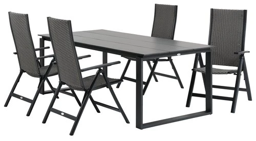 Aluminium och DURAWOOD® kompositträ. DURAWOOD® är ett slitstarkt kompositmaterial som består av FSC® hårdträfiber och plast. B100 x L215 x H75 cm. Stol: Aluminium och konstrotting. 6 positioner. Hopfällbar.