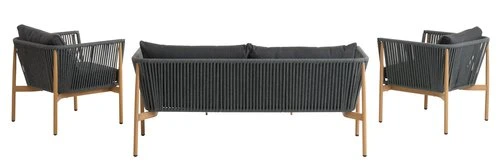 Bord: Aluminium och fibercement. B70 x L110 x H42 cm. 3-sits soffa och stol: Aluminium och UV-skyddad polyester. Inkl. exklusiva dynor med snabbtorkande, strukturvävt överdrag. Överdraget har ett vattentätt skikt på insidan, som hindrar vatten från att komma in i dynan.