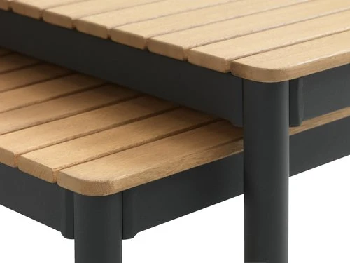 Bord: Aluminium och oljat FSC® hårdträ. B72/62 x L72/62 x H39/32 cm. 3-sits soffa och stol: Aluminium och oljat FSC® hårdträ. Inkl. exklusiva dynor med slitstarkt, strukturvävt överdrag.