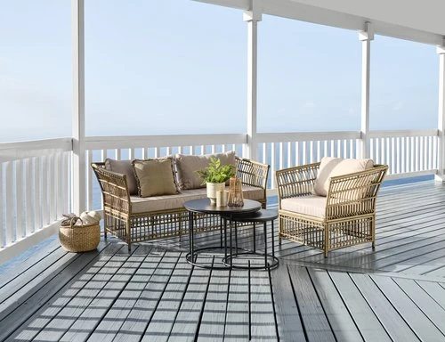 Stål och konstrotting. Inkl. exklusiva dynor med slitstarkt, strukturvävt överdrag. B79 x H75 x D74 cm