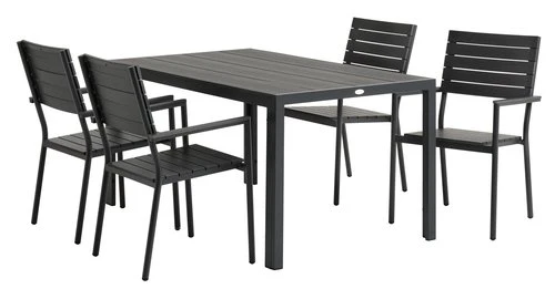 Bord: Aluminium och konstträ. B90 x L150 x H74 cm. Stol: Aluminium och konstträ. Stapelbar.