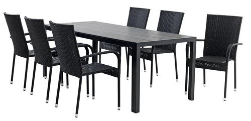 Bord: Aluminium och konstträ. B90 x L205 x H74 cm. Stol: Stål och konstrotting. Stapelbar.