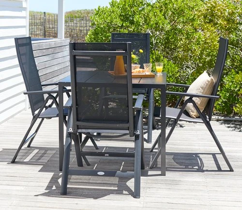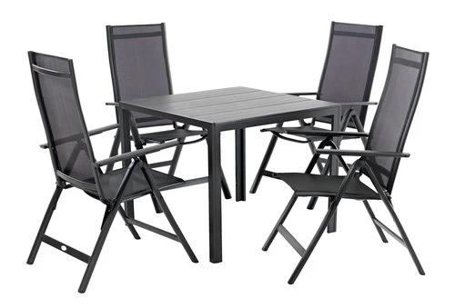 Bord: Aluminium och konstträ. B90 x L90 x H74 cm. Stol: Aluminium och textilene. 6 positioner. Hopfällbar.