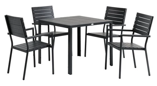 Bord: Aluminium och konstträ. B90 x L90 x H74 cm. Stol: Aluminium och konstträ. Stapelbar.