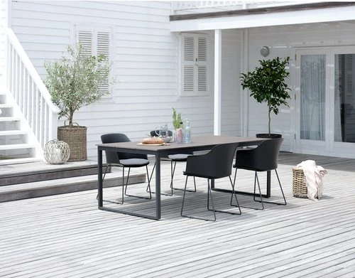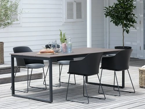 Bord: Aluminium, stål och konstträ. B100 x L210 x H74 cm. Stol: Stål och formgjuten, UV-skyddad plast.