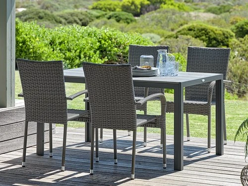 Bord: Aluminium och konstträ. B90 x L150 x H74 cm. Stol: Stål och konstrotting. Stapelbar.