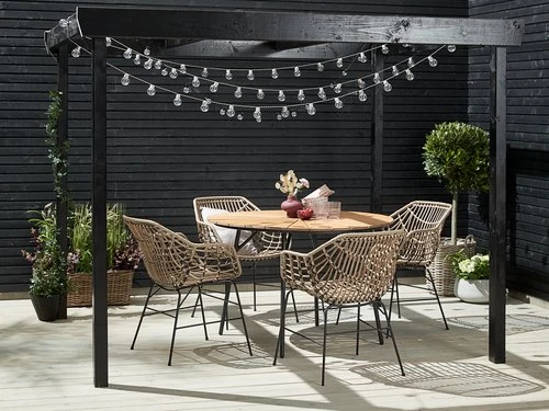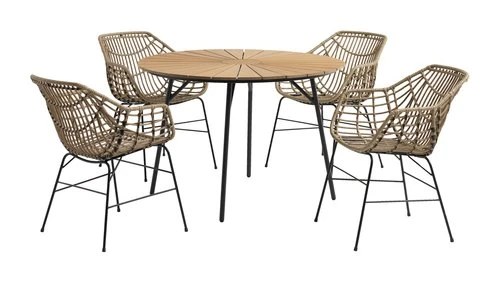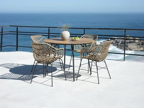Bord: Aluminium och konstträ. Ø110 x H74 cm. Stol: Stål och konstrotting.