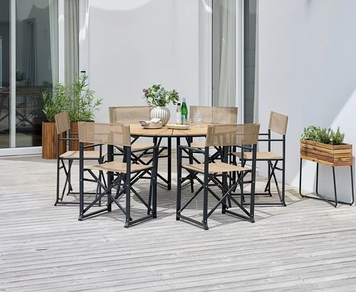 Bord: Aluminium och konstträ. Ø130 x H74 cm. Stol: Stål och textilene. Hopfällbar.