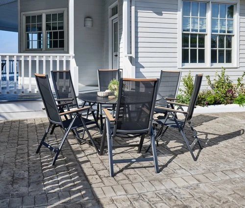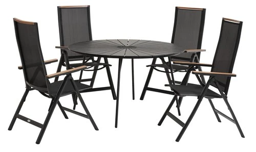 Bord: Aluminium, konstträ och fibercement. Ø130 x H74 cm. Stol: Aluminium och textilene. 6 positioner. Hopfällbar.