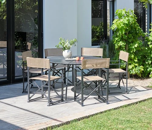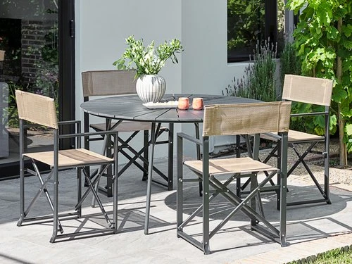 Bord: Aluminium, konstträ och fibercement. Ø130 x H74 cm. Stol: Stål och textilene. Hopfällbar.