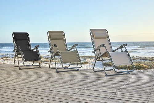 Stål och polyester. Steglös justering av stolsrygg och benstöd. Hopfällbar.