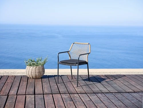 Aluminium, textilene och konstrotting. Inkl. kvalitetsdyna med slitstarkt överdrag. Stapelbar.