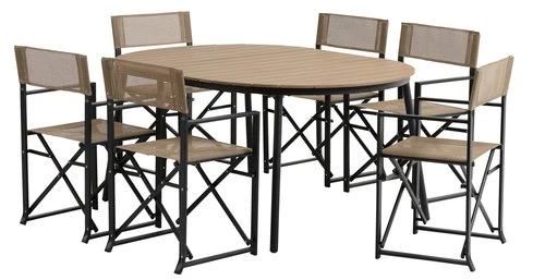 Bord: Aluminium, stål och konstträ. Inkl. 1 klaff. B120 x L120/170 x H75 cm. Stol: Stål och textilene. Hopfällbar.