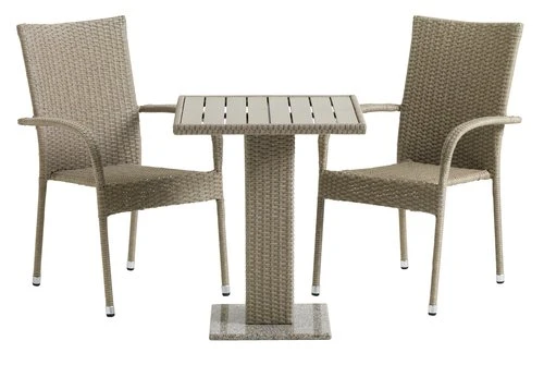 Bord: Aluminium, konstträ, konstrotting och granit. B60 x L60 x H72 cm. Stol: Stål och konstrotting. Stapelbar.