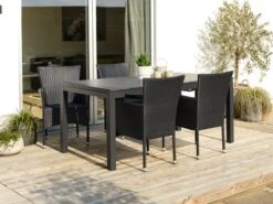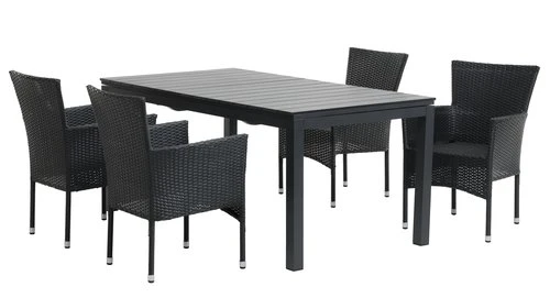 Bord: Aluminium och konstträ. Inkl. 2 klaffar, som kan förvaras under bordsskivan. B95 x L170/273 x H76 cm. Stol: Stål och konstrotting. Stapelbar.