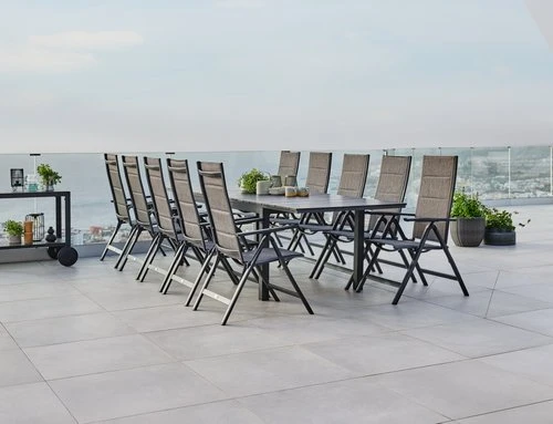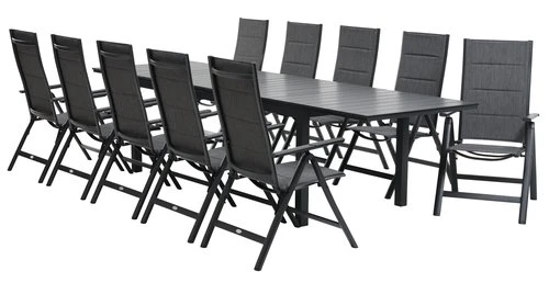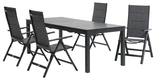 Bord: Aluminium och konstträ. Inkl. 2 klaffar, som kan förvaras under bordsskivan. B95 x L206/319 x H76 cm. Stol: Aluminium, textilene och snabbtorkande skumstoppning. 6 positioner. Hopfällbar.