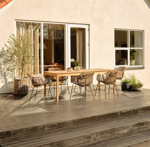 Bord: Massiv FSC® teak. B90 x L210 x H75 cm. Stol: Stål och konstrotting.