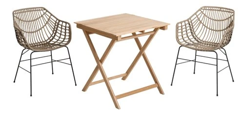 Bord: Massiv FSC® teak. Hopfällbart. B70 x L70 x H74 cm. Stol: Stål och konstrotting.